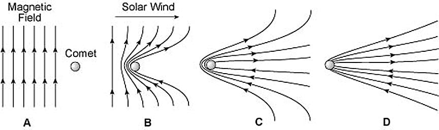 . It's long been known that a comet's electrified or ionized gases present an obstacle to the solar wind, causing it to drape around the nucleus and shape the streamlined blue-tinted ion or gas tail.