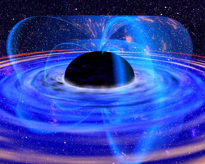 This black hole picture shows the invisible black hole at the center surrounded by an accretion disk of material. The rapid rotation of the black hole interacts with the accretion disk generating powerful magnetic fields.