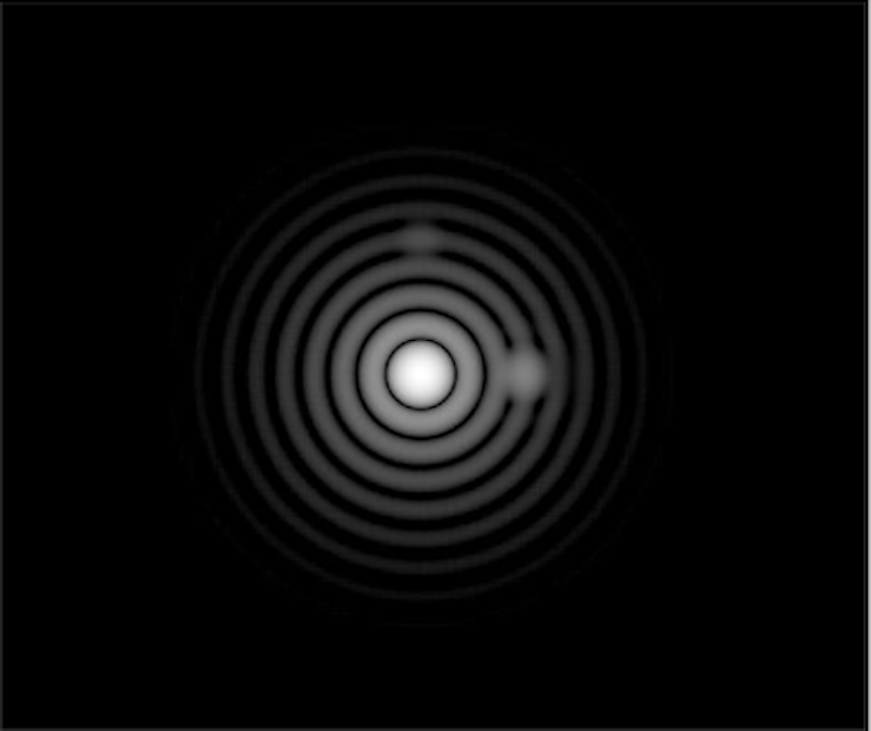 A logarithmically scaled simulation of the image of a star with two nearby exoplanets, as seen by a telescope with a circular aperture. The centred multi ringed Airy pattern is due to diffraction of the starlight. Off-axis exoplanets fainter by 100 times and 1000 times are seen at 3 o’clock on the 3rd Airy ring, and at 12 o’clock on the 4th Airy ring, respectively. An Earth like exoplanet would be 10 million times fainter than the dimmer of the two exoplanets shown (Credit : Gene Serabyn, NASA JPL)
