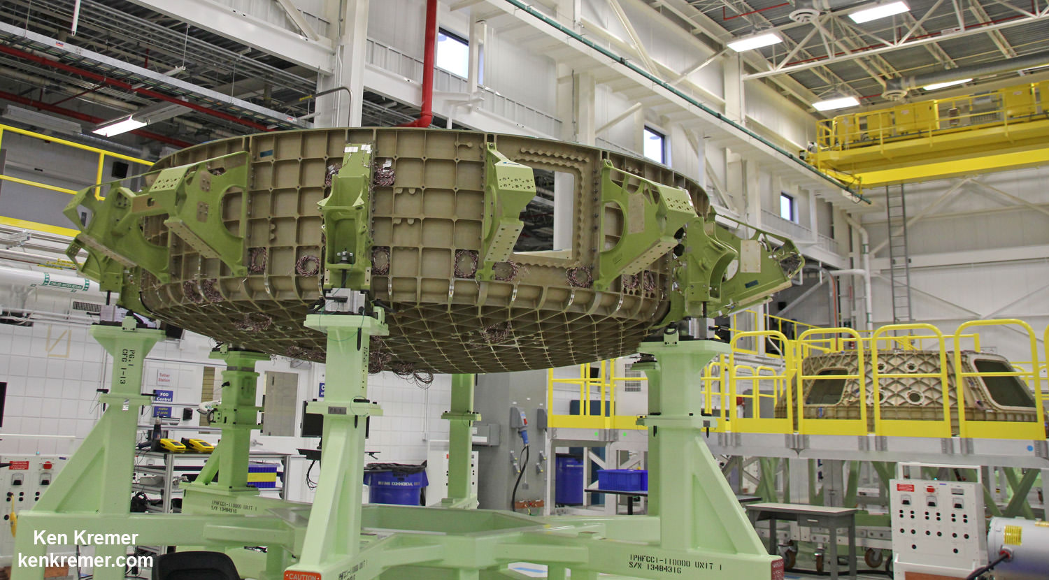 Boeing and NASA managers pose with the Boeing CST-100 Starliner crew module being assembled into the Structural Test Article at company's C3PF facility at the Kennedy Space Center in Florida. From left are John Mulholland, Boeing Vice President Commercial Programs; Chris Ferguson, former shuttle commander now Boeing deputy manager Commercial Crew Program; John Elbon, Boeing vice president and general manager of Space Exploration; and Robert Cabana, former shuttle commander and now Director NASA's Kennedy Space Center, on Sept. 4, 2015. Credit: Ken Kremer/kenkremer.com [/caption]
