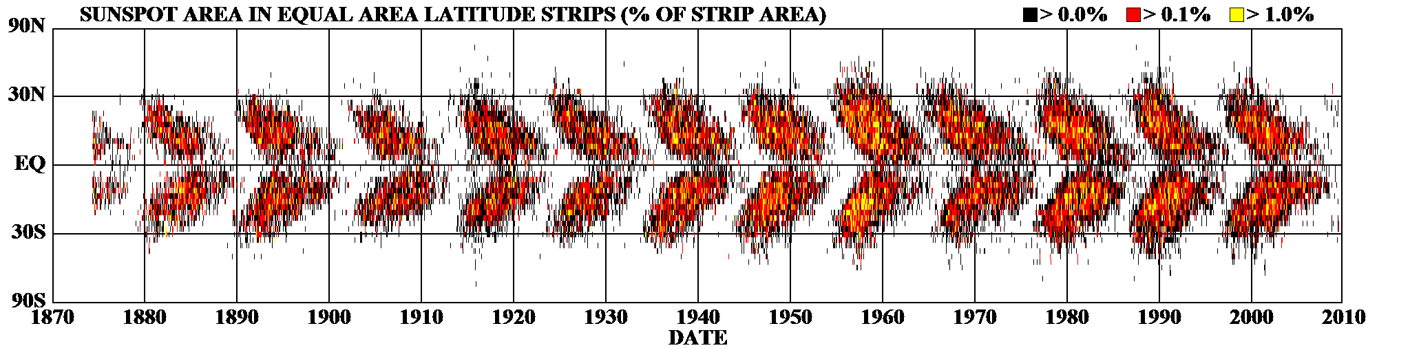 The observations revolve around a familiar diagram known as the Butterfly diagram (pictured above). This diagram depicts the position of sunspots at various latitudes on the sun's surface as time progresses. At the beginning of a cycle, sunspots start of at high latitudes and as the cycle progresses, appear at lower and lower latitudes until they disappear and the cycle repeats. The pattern formed resembles the wings of a butterfly, thereby giving the diagram its name.