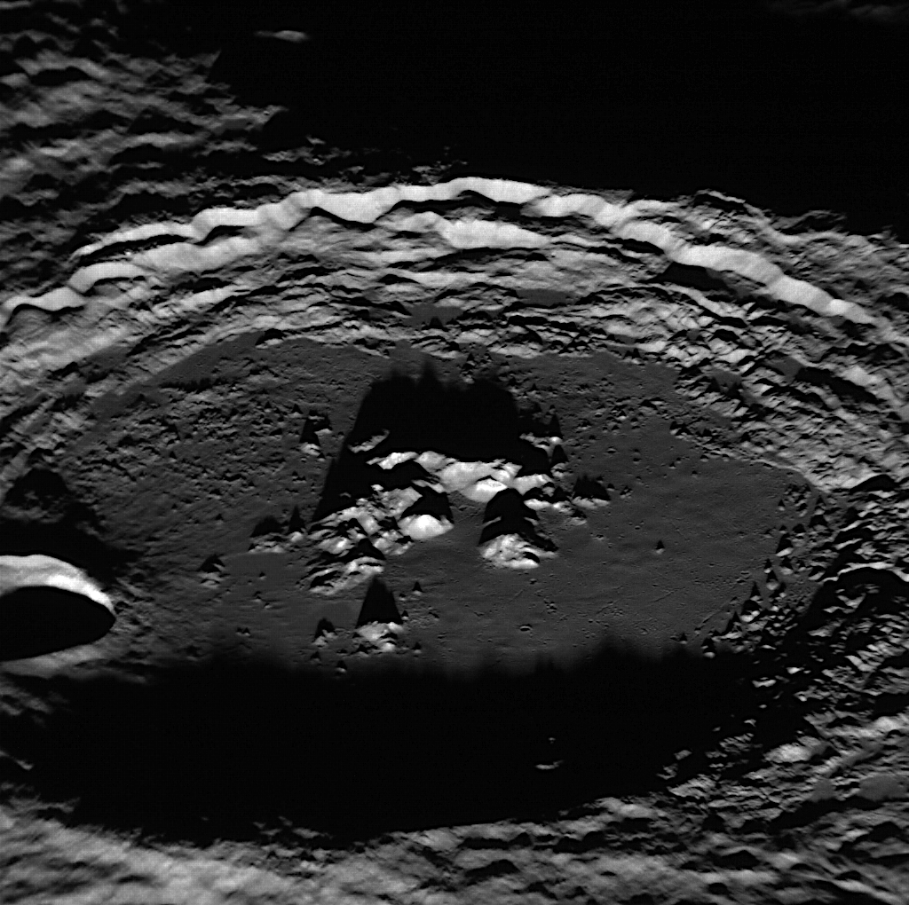 spacecraft on Feb. 4, 2012. Long shadows are cast by the crater's peaks and rugged rim (north is to the left.)