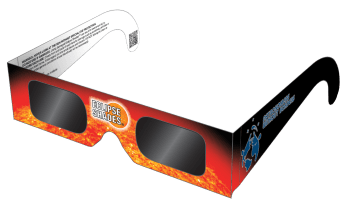 These Eclipse Shades® Safe Solar Glasses are absolutely safe for direct solar viewing of solar eclipses and sunspots. The black polymer lens material is scratch resistant, optical density 5 and CE certified. It filters out 100% of harmful ultra-violet, 100% of harmful infrared, and 99.999% of intense visible light and creates a pleasing orange image of the Sun.