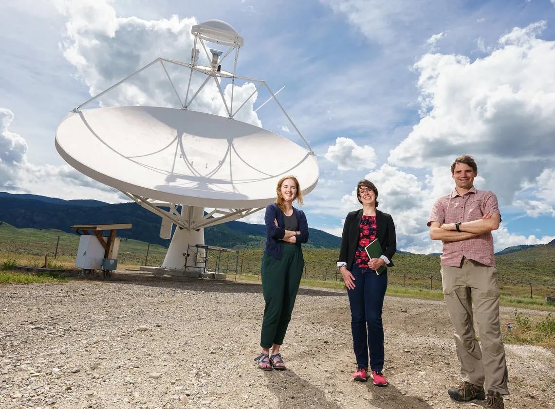 *Researchers, from left, Rebecca Booth, Anna Ordog, and Alex Hill, next to the telescope used to collect the data for their study. Credit: NRC/Conseil National de Recherches Canada*