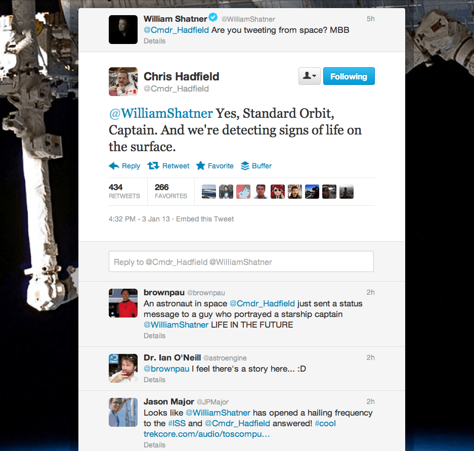 You know that you're living in a very special point in time when you can watch a man who became famous playing a starship captain on television send a tweet to a man who's