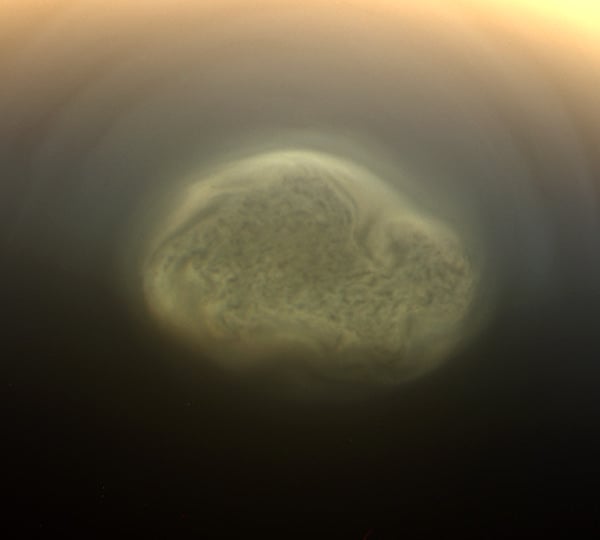 The southern vortex structure was also captured in raw images acquired by Cassini on June 28. A color-composite made from three of those raw images is below (the vortex can be seen at center just right of the terminator):