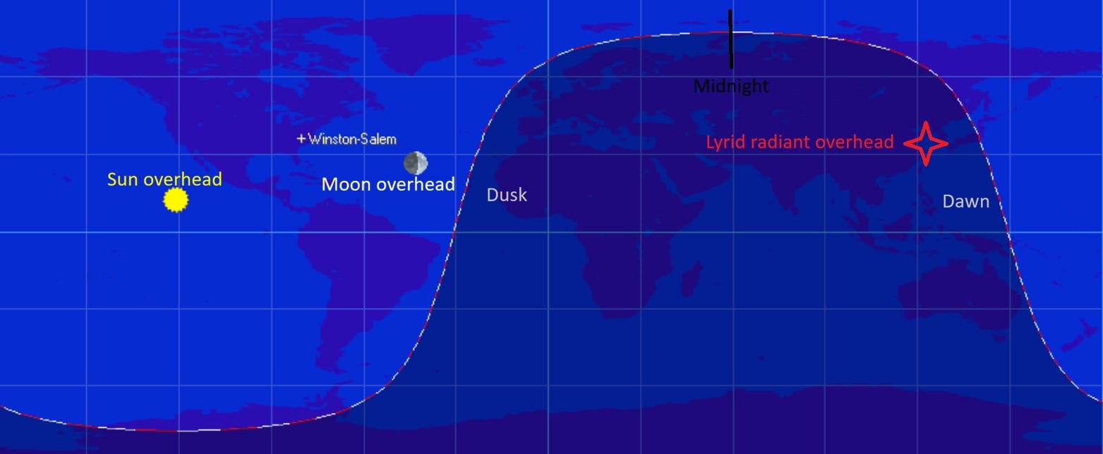 A global map showing the circumstances for the 2026 Lyrids at the shower's peak. Credit: Created by the author using Orbitron.