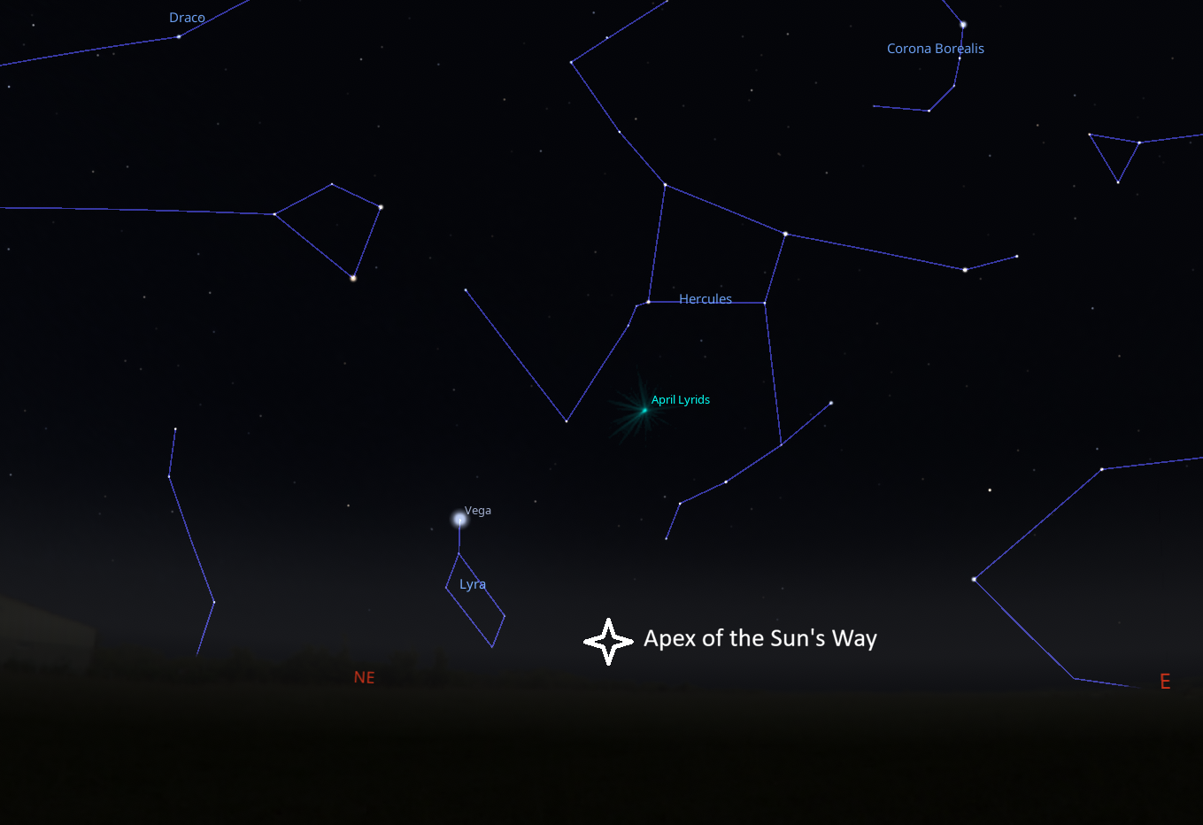 In modern times, the shower radiant for the Lyrids is actually located across the border of Lyra in the constellation Hercules, very near what's known as the Apex of the Sun’s Way, sometimes known simply as the Solar Apex. Look just a few degrees south of the bright star Vega, (Alpha Lyrae), and you’re staring directly towards the point that the solar system (and Earth along with it) is currently hurdling towards on our journey around the Milky Way Galaxy. We’re moving at 13.4 kilometers per second versus the local standard of rest and the local stars in our galactic neighborhood, Combined, we’re moving at a speed of 220 kilometers per second overall versus the galactic center. Even at that rate, it still takes us about a quarter of a billion years to complete one orbit around our host galaxy.