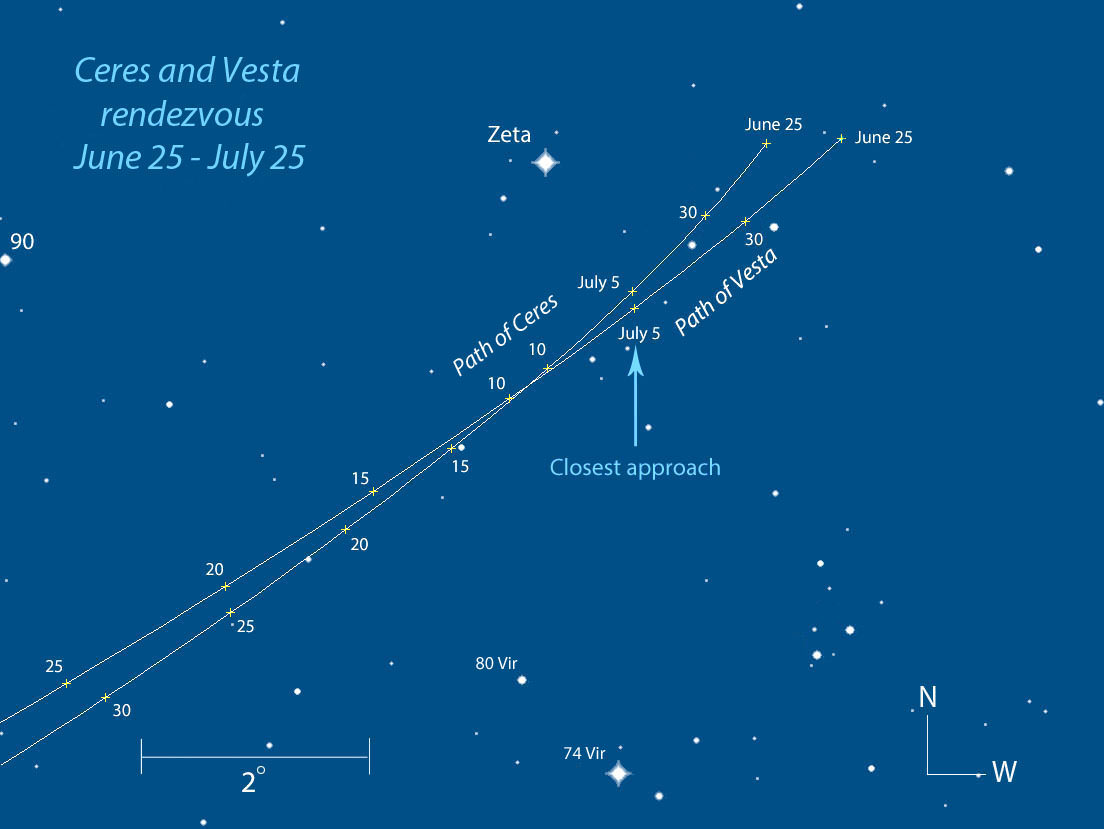 , the largest and brightest asteroids respectively, were speeding through Virgo in tandem. Since then both have faded, but the best is yet to come. Converging closer by the day, on July 5, the two will make rare close pass of each other when they'll be separated by just 10 minutes of arc or the thickness of a fat crescent moon.