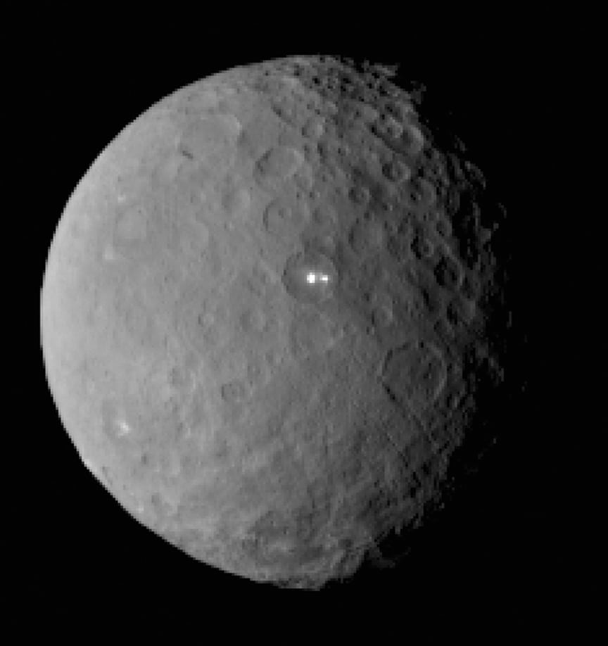 Chris Russell, principal investigator for the Dawn mission, offers another possible scenario, where the bright spots "may be pointing to a volcano-like origin." Might icy volcanism in the form of cryovolcanoes have created the dual white spots? Or is the white material fresh, pale-colored rock either erupted from below or exposed by a recent impact? Ceres is a very dark world with an
