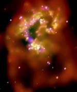 "The amount of enrichment of elements in The Antennae is phenomenal," said Giuseppina Fabbiano of the Harvard-Smithsonian Center for Astrophysics (CfA) in Cambridge, Mass. at a press conference at a meeting of the American Astronomical Society in Atlanta, Ga. "This must be due to a very high rate of supernova explosions in these colliding galaxies." Fabbiano is lead author of a paper on this discovery by a team of U.S. and U.K. scientists that will appear in an upcoming issue of The Astrophysical Journal Letters.