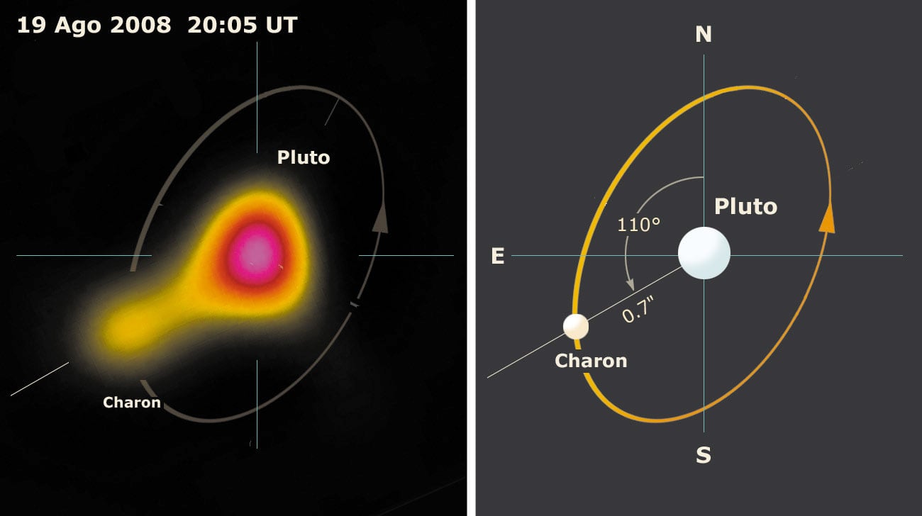 . "Imaging Charon is very difficult and nobody has spotted it with amateur equipment, so far," said Daniele Gasparri, one of the members of the group. The team made several attempts, and finally, one member of the group, Antonello Medugno, took this interesting image. "After many calculations," said Gasparri, "we are sure that this image shows clearly Pluto and Charon, for the first time with amateur equipment." Comparing the image to the graphic which shows the position of Pluto and Charon on the same date, it's obvious, they nailed it! This is quite a feat considering their equipment was an "amateur" 14-inch telescope! Also, as