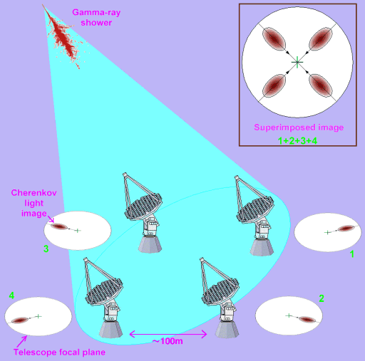 Perhaps the best known astronomical use of Cherenkov radiation is in ICATs such CANGAROO (you guessed it, it's in Australia!), H.E.S.S. (astronomers love this sort of thing, that's a 'tribute' to Victor Hess, pioneer of cosmic rays studies), and VERITAS (see if you can explain the pun in that!). As a high energy gamma ray, above a few GeV, enters the atmosphere, it creates electron-positron pairs, which initiate an air shower. The shower creates a burst of Cherenkov radiation lasting a few nanoseconds, which the ICAT detects. Because Cherenkov radiation is well-understood, the bursts caused by gamma rays can be distinguished from those caused by protons; and by using several telescopes, the source 'on the sky' can be pinned down much better (that's what one of the Ss in H.E.S.S. stands for, stereoscopic).