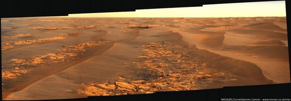 "The wonderful thing about UMSF is that the community there generally takes exactly the right level of liberties with the data," said Lakdawalla, "basically, enough fudging as is required to prevent the viewer from being distracted by artifacts of the imaging process, but little enough to let the original space data do all the talking." [caption id="attachment_23819" align="aligncenter" width="580" caption="A fanciful image of Opportunity's reflection in its heat sheild -- an image that was never taken, but created by Stuart Atkinson. Credit: NASA/JPL/Stuart Atkinson"]