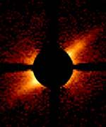 The pictures of AU Mic were obtained by blocking glare from the star with a coronagraph like that used to view the sun's outer atmosphere, or corona. The eclipsing disk on the University of Hawaii's 2.2-meter telescope blocked view of everything around the star out to about 50 AU. At this distance in our solar system, only the Kuiper Belt of asteroids and the more distant Oort cloud, the source of comets, would be visible.