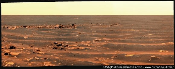 Canvin told me that the crater near the center-left, off in the distance, is Nautilus. The rocks in the near-field are the surroundings to Nereus crater to which is Oppy was right next to and is out of frame to the left. The rover has already driven in the direction of the center of the image (this is a 'drive direction' mosaic after all!), and a much larger mosaic of this is still being downlinked from the rover, which should be even more spectacular.