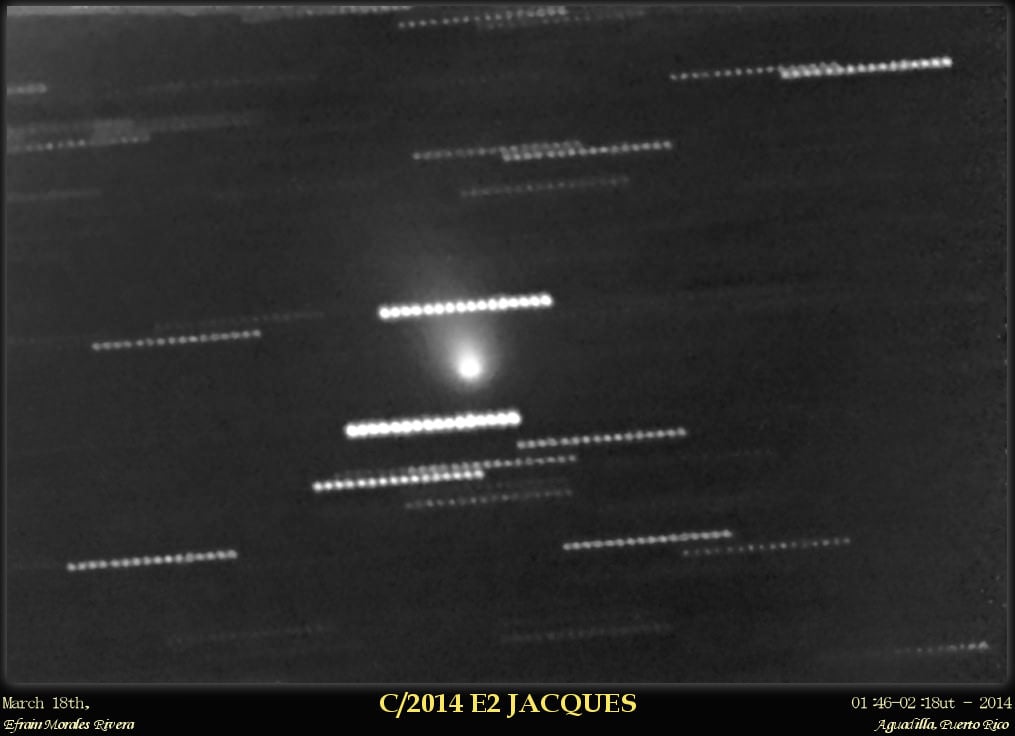 Comet C/2014 E2 Jacques was discovered on March 13th2014 by Cristóvão Jacques, Eduardo Pimentel and João Ribeiro de Barros while observing from the Southern Observatory for Near Earth Asteroids Research (SONEAR) facility located near Oliveira, Brazil.The comet was just about at +15thmagnitude at the time of discovery as it glided across the southern hemisphere constellation of Centaurus.