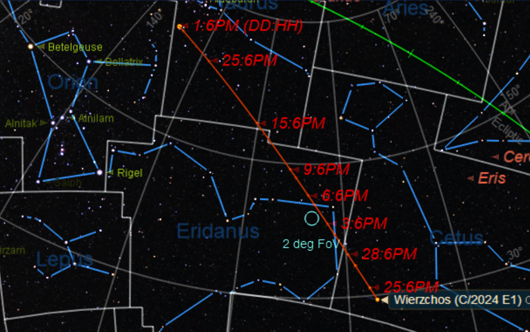 Meanwhile, we have another wait-and-see comet inbound: sungrazer C/2026 A1 MAPS. The comet is developing nicely, currently shining at +12th magnitude in the constellation Eridanus. The question of the hour is: will it survive its scorching perihelion on April 4th, or simply head off to meet the fiery fate of so many sungrazers before it? Comet A1 MAPS and E1 Wierzchos actually pass just two degrees from one another coming right up on March 1st.