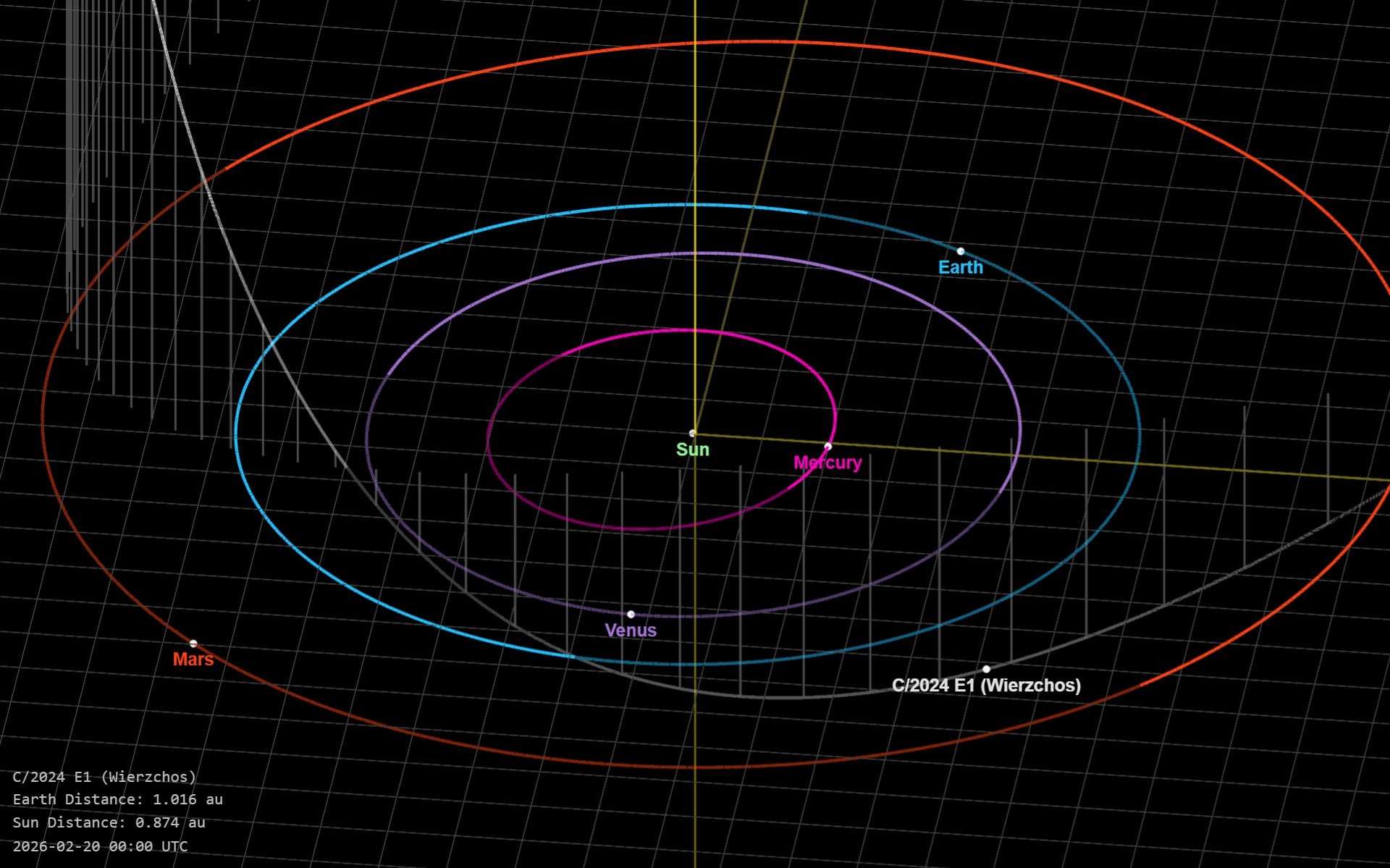 The orbital path of comet C/2024 E1 Wierzchos through the inner solar system. Credit: NASA/JPL.