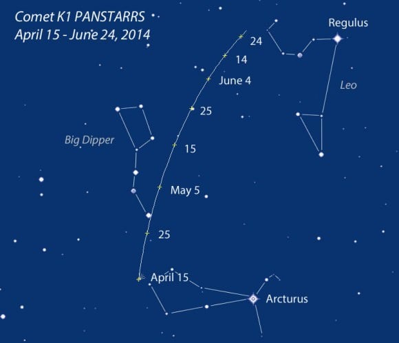 The first lurks in Hercules but come early April should bulk up to magnitude 9.5, bright enough to track in a small telescope for northern hemisphere observers. Watch K1 PANSTARRS amble from Bootes across the Big Dipper and down through Leo from mid-spring through late June hitting magnitude 7.5 before disappearing in the summer twilight glow. K1 will be your go-to comet during convenient viewing hours.