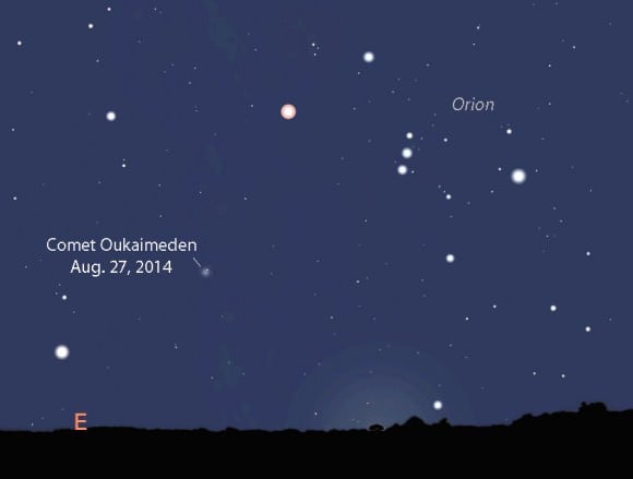 Comet Oukaimeden may glow around 8th magnitude in late August 2014 when it rises with the winter stars before dawn. Stellarium.[/caption]
