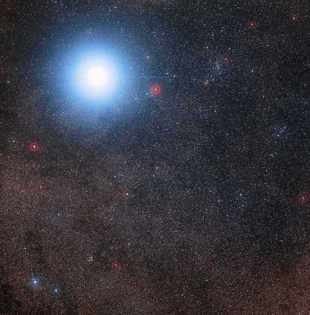 This image of the sky around the bright star Alpha Centauri AB also shows the much fainter red dwarf star, Proxima Centauri, the closest star to the Solar System and maybe the destination for our first interstellar craft driven by light propulsion (Credit : Digitised Sky Survey 2)