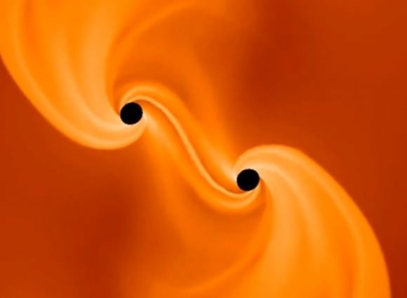 Two nascent black holes formed by the collapse of an early supergiant star. From a visualization by by Christian Reisswig (Caltech).[/caption]