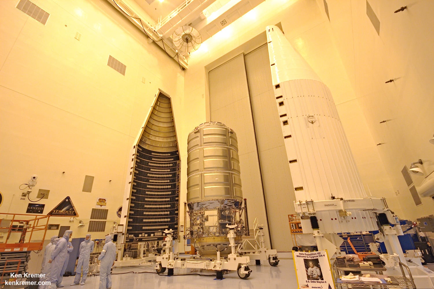 Inside the Payload Hazardous Servicing Facility high bay clean room at NASA's Kennedy Space Center in Florida, where the Orbital ATK Cygnus pressurized module is being processed for Dec. 3, 2015 launch, Dan Tani, former astronaut and now Orbital ATK VP for Mission and Cargo Operations, center, poses with Cygnus and mural of Deke Slayton, along with Randy Gordon, Launch Support Project manager for NASA, and Kevin Leslie, ULA Mission manager. Credit: Ken Kremer/kenkremer.com[/caption]