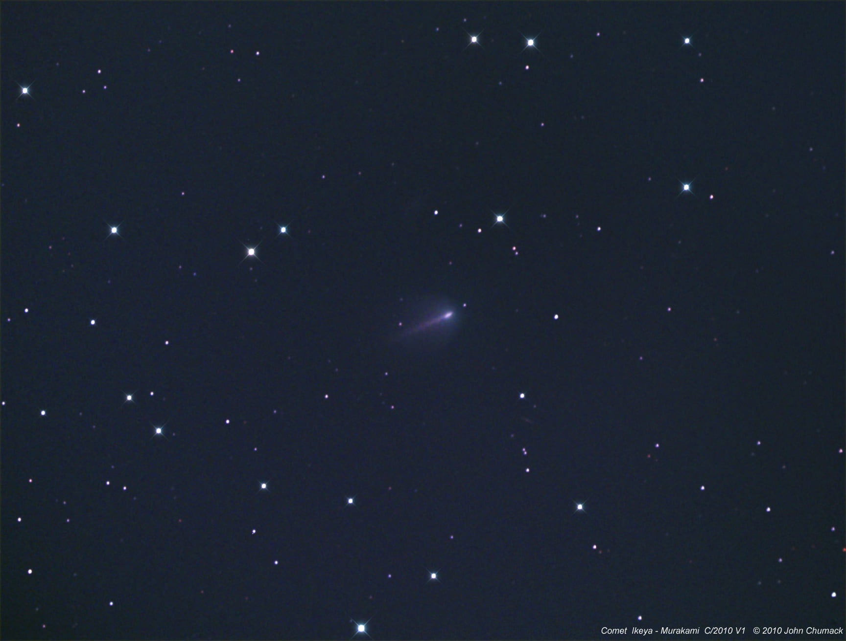 So, what would the comet be like to watch for awhile? First off, remember that what you will see in binoculars and a small telescope will resemble a small, unresolved globular cluster. It will be a faint fuzzy with a faint tail. More aperture will help, but the approaching Sun is the real culprit here. Comet C/2010 V1 Ikeya Murakami won't be terribly bright, but you might catch other interesting things while you watch, too. Just ask the one and only