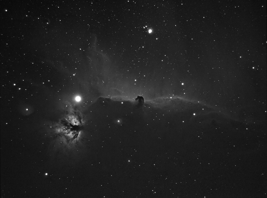 , we're getting a preview of one of the most sought after dark nebulae in the heavens - the "Horsehead". The long tongue of nebulosity which makes it visible is IC 434, first discovered photographically by Edward Pickering in 1889. But it wasn't until January 25, 1900 that Isaac Roberts picked up the dark notch on a photo he'd made and E.E. Barnard visually recognized it around 1910.