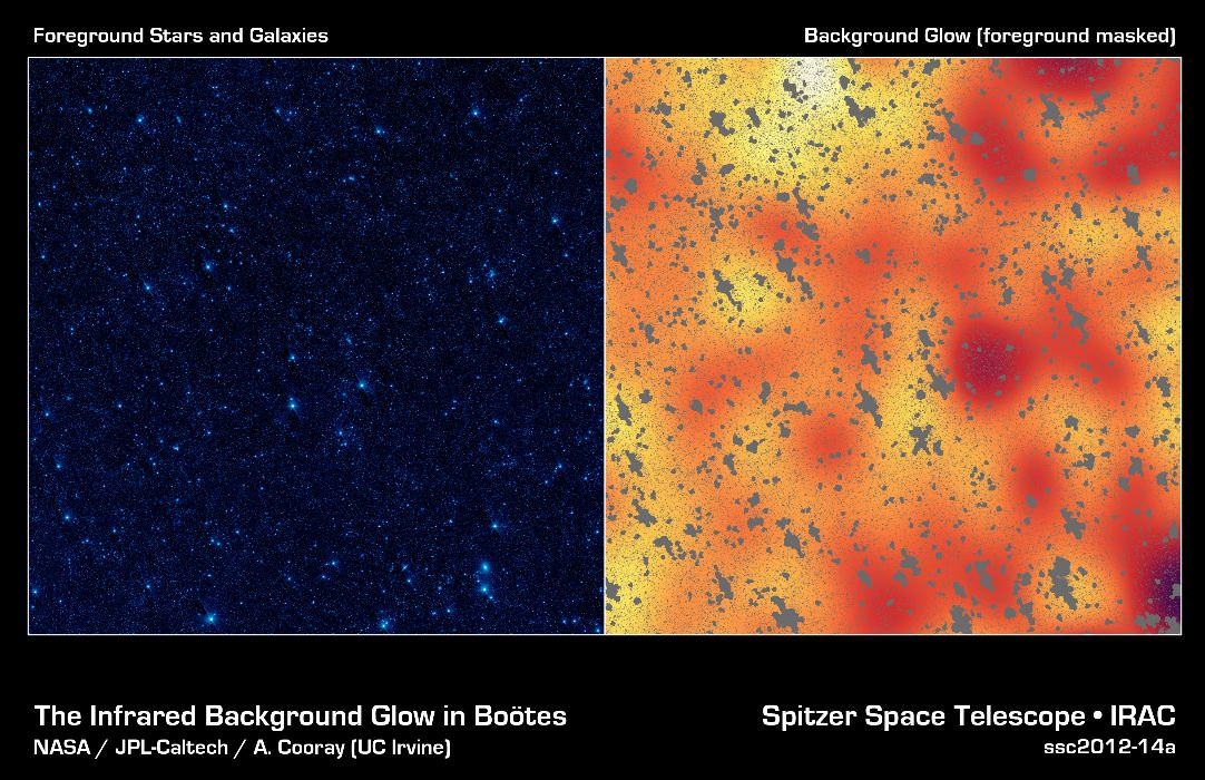 The team concluded the light pattern of the infrared glow is not consistent with theories and computer simulations of the first stars and galaxies. Researchers say the glow is too bright to be from the first galaxies, which are thought not to have been as large or as numerous as the galaxies we see around us today. Instead, the scientists propose a new theory to explain the blotchy light, based on theories of "intracluster" or "intrahalo" starlight.