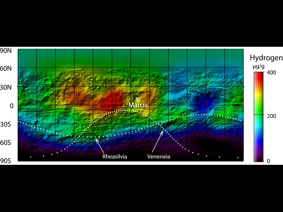 Hydroxyl has recently been found on the Moon in permanently shadowed craters at the lunar poles, and so the Dawn scientists thought there might be a chance that water ice may have hunkered down near the surface around the giant asteroid's poles, as well. But unlike Earth's Moon, however, Vesta has no permanently shadowed polar regions, and so the strongest signature for hydrogen actually came from regions near the equator. And there, water ice is not stable.