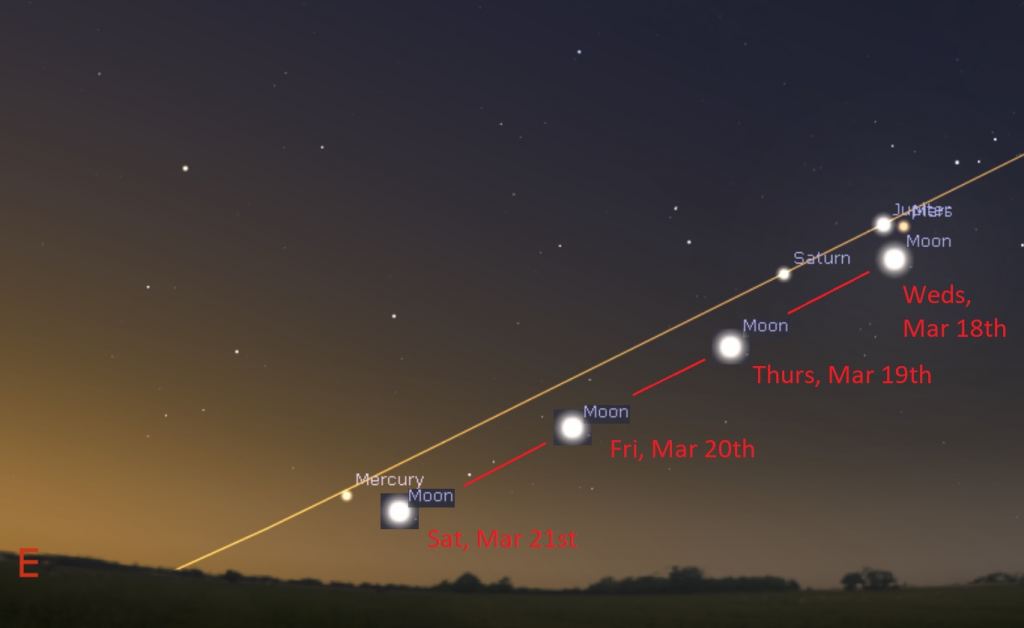 Now for the good news: this week, the thinning crescent Moon visits the grouping of planets, in a thrilling set of dawn conjunctions centered on the morning of Wednesday March 18th. Another plus: the shift one hour ahead to Daylight Saving Time on March 8thfor most of North America means that extra lost hour of evening darkness has moved to the morning.