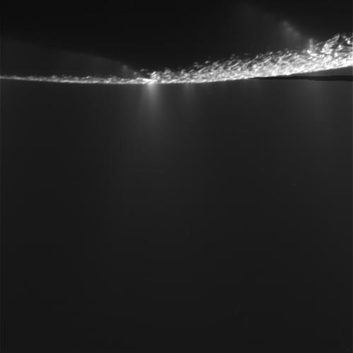 Raw images are already being returned from Cassini's Nov. 21 "E-8" or eighth flyby of the tiger-striped moon Enceladus. Visible in this raw image are several plumes from fissures in the south polar region of the moon. These fissures spew jets of water vapor and other particles hundreds of kilometers from the surface. This flyby included a very different geometry to the flyby trajectory – and a different look at the plumes --- approaching within 1,606 kilometers (997.9 miles) of the surface, buzzing over 82 degrees south latitude. This is the last look we'll have for several years at this intriguing area of Enceladus before winter darkness blankets the area. See below for looks at Baghdad Sulcus, the "tiger stripe" that scientists were focusing on.
