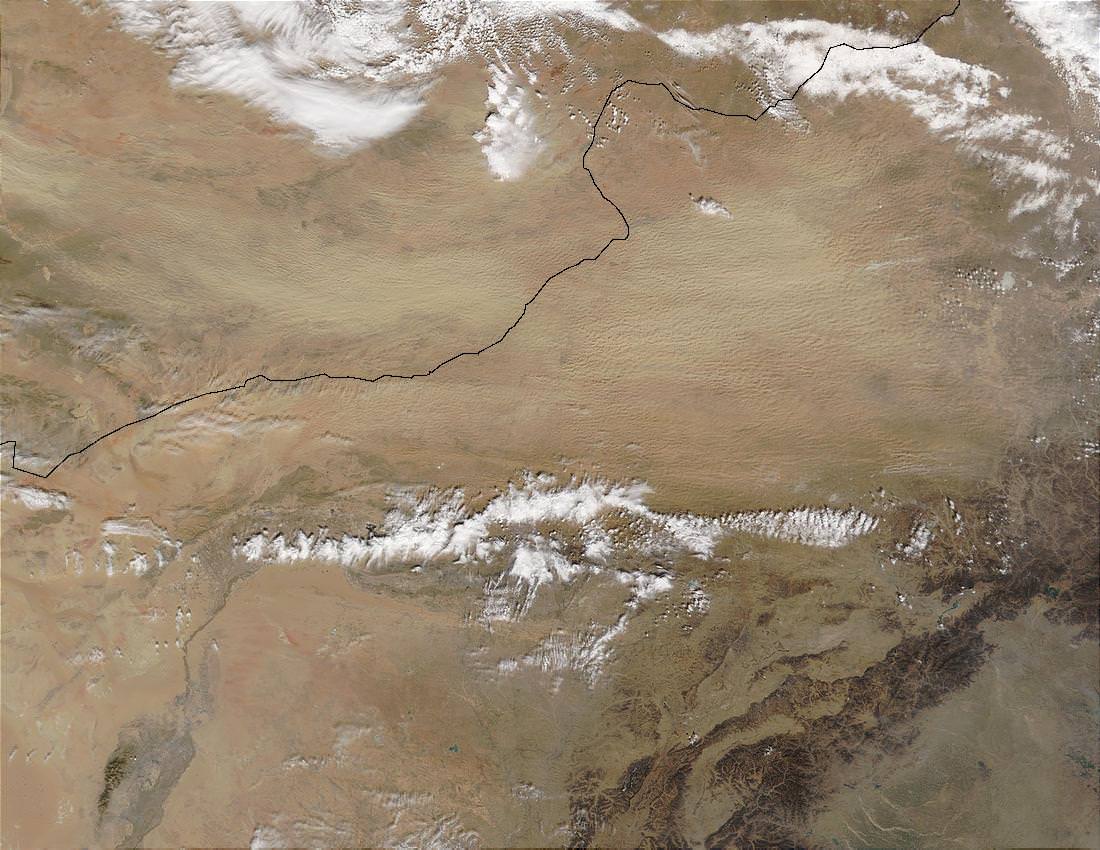 This is an image of the Gobi Desert taken from space. The top part of the image looks pockmarked, but that's because the wind generated an enormous dust storm that obscured a large part of the region.