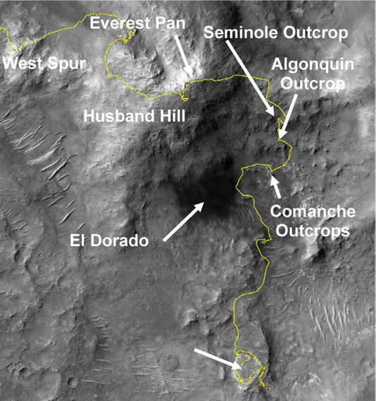Locator image for Comanche outcrops in the Columbia Hill of Gusev Crater, Mars. Yellow line marks Spirit's traverse. Pancam panoramic images were taken near the true summit of Husband Hill (Everest Pan) and at the location of the Seminole outcrop. Spirit was then located on the left side of Home Plate. Image width is ~1000 m. Image courtesy of NASA/UA/HiRISE using PSP_001513_1655_red image. After Arvidson et al. [2008][/caption]Getting more information, however, would be one way to add credence to the theory. That's why the team is also pushing for the forthcoming