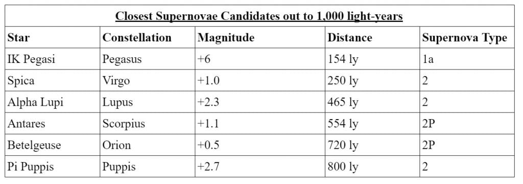 There's also good evidence to suppose that nearby supernovae early in the solar system's youth seeded the early solar nebulae with heavy elements, notably Iron-60 and Nickel-60. Thankfully, there are currently no good supernova candidates in the 25 light-year radius 'kill zone' inside the Local Bubble… any good naked eye supernova will simply put on a good show.