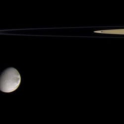 Dione underneath Saturn's wispy F ring. Image credit: NASA/JPL/SSI.