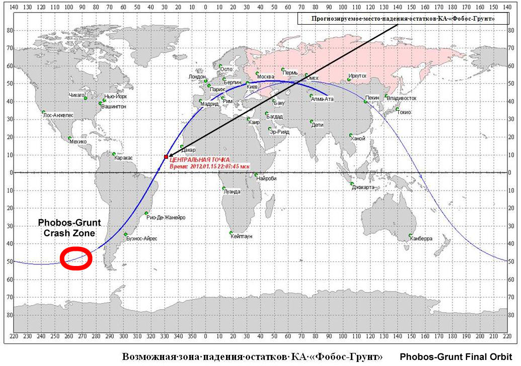 Since the re-entry was uncontrolled, the exact time and location could not be precisely calculated beforehand. [caption id="attachment_92634" align="alignleft" width="417" caption="Mission Poster for the Russian Phobos-Grunt soil sample return spacecraft that launched to Mars and its moon Phobos on 9 November 2011. The mission did not depart Earth orbit when the upper stage engines failed to ignite. Credit: Roskosmos ( Russian Federal Space Agency)/IKI"]