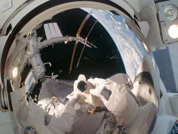 And if you like the image above, it is from the current STS-124 mission: Astronaut Mike Fossum used a digital camera to create this self-portrait during one of the EVAs of the mission, with both himself and the International Space Station visible in his helmet visor.
