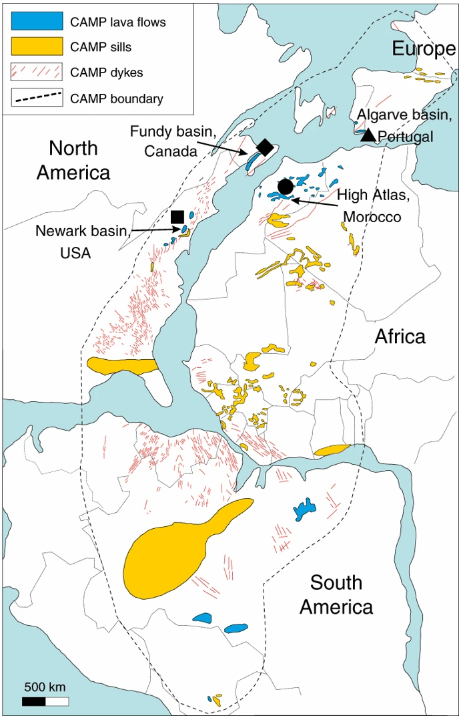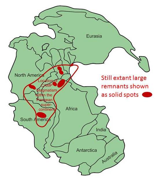 At the time of the J-T extinction, Earth's land mass was one large continent called Pangaea. CAMP was roughly in the center of Pangaea. Some of the left-over elements of CAMP are still visible today.