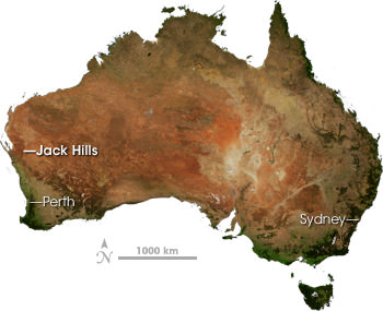 The Jack Hills in Western Australia contain the oldest rocks known to exist on Earth. A team studying them concludes that early Earth was mostly a water world. By NASA Earth Observatory - http://earthobservatory.nasa.gov/Study/Zircon/zircon.html, Public Domain, https://commons.wikimedia.org/w/index.php?curid=738512[/caption]
