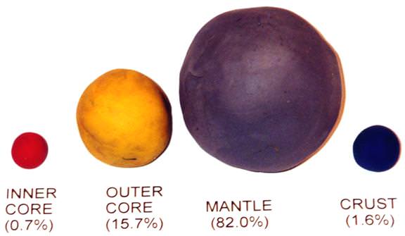 To make your own, you need some modeling clay of different colors. You start by making a ball about 1.2 cm across. This represents the Earth's inner core. Then you make a second ball about 3 cm across. This ball represents the Earth's outer core. Then you make a third ball about 6 cm across. This ball represents the Earth's mantle. And finally, you make some flattened pieces of clay that will be the Earth's crust. To make it extra realistic, make some pieces blue and others green.