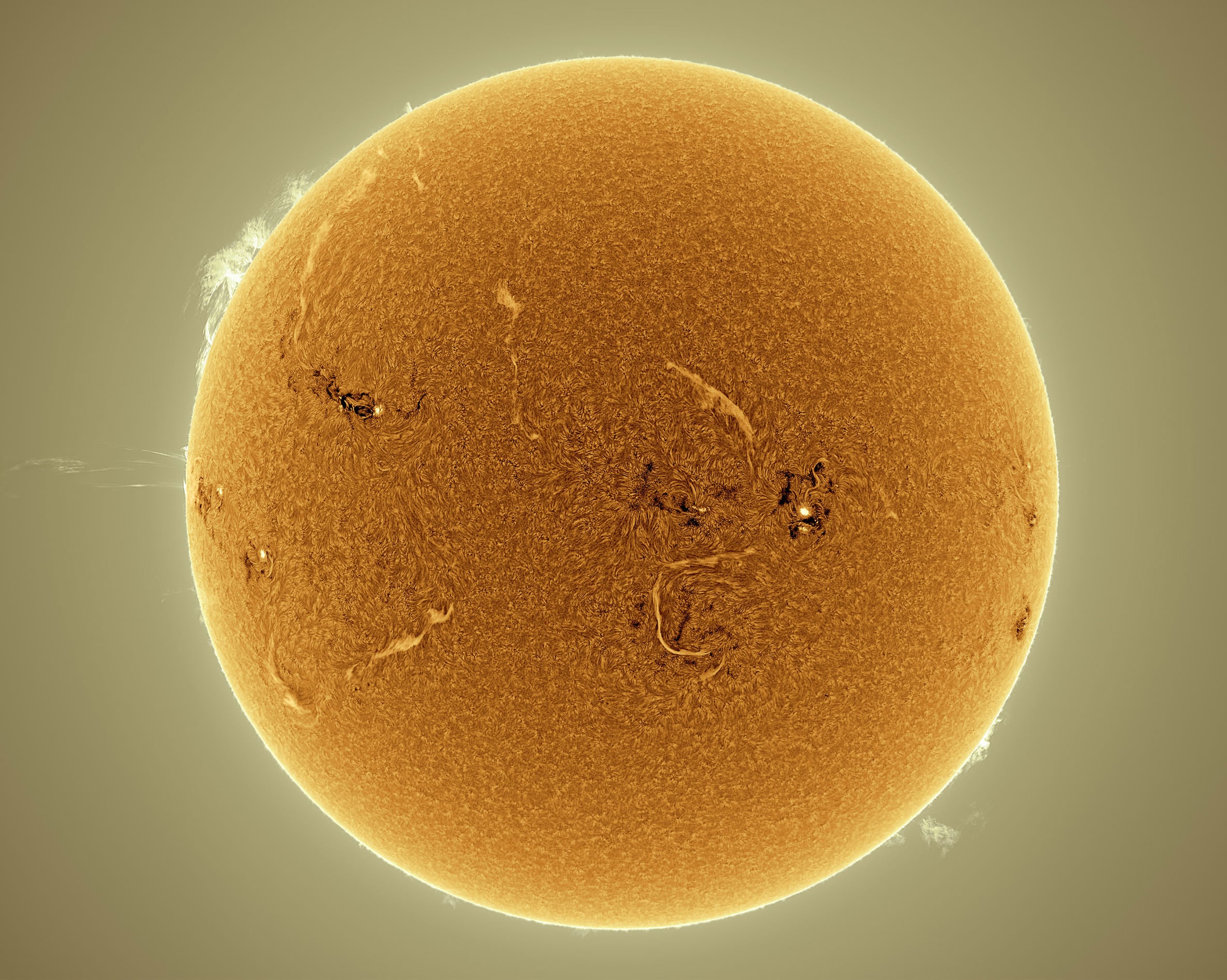 In Alan's image from Aug. 24 several active sunspot regions can be seen, as well as long snaking filaments (which show up bright in this inverted view – in optical light they appear darker against the face of the Sun) and several prominences rising up along the Sun's limb, one of which along the left side stretching completely off the frame a hundred thousand miles into space!