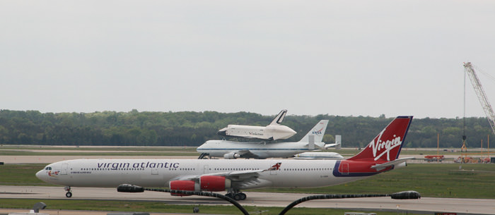 Right now and continuing over the next few days, supremely lucky passengers seated aboard arriving and departing jets at Dulles are enjoying a truly stupendous bird's-eye view of the winged NASA orbiter that most aerospace fans can only dream of. Just be sure to sit on the correct side on the plane.