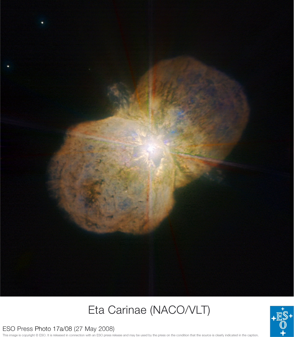). This is one of the finest examples of a star going through the last phase of its life as a "luminous blue variable". The hot gas forming the "Homunculus" originates from a great outburst observed in 1843 and some time in the next 100,000 years, the star will die, exploding as a supernova. This new image is 6 to 7 times better resolved than previous images of Eta Carinae as the VLT has applied some of the most advanced adaptive optical technology (called NACO) to remove the blurring effect of the atmosphere. Now, the fine scale of Eta Carinae can be seen, clearly showing the jets blasting from the central star and the bipolar structure.
