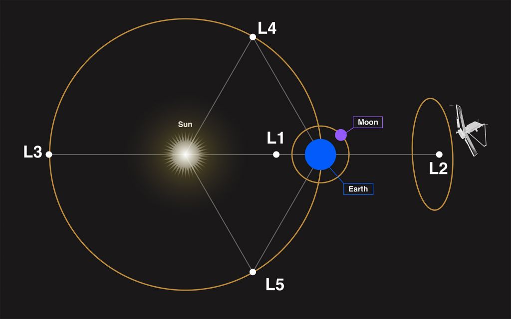 Euclid is now located at the Lagrange point known as L2, which is a gravitational equilibrium point on the shadow side of Earth about 1.5 million kilometers away. L2 is useful because it provides a gravitationally stable location protected from the heat of the Earth and the Sun. It's a popular location for telescopes, currently also used by Gaia and JWST. Past telescopes such as WMAP and Planck have used the site, and it will be used for future missions such as the Nancy Grace Roman telescope.
