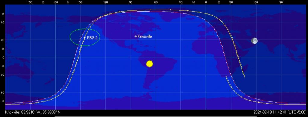 Reentry predictions for the satellite are centered on February 21stat 00:19 Universal Time (UT)+/- 25 hours. As we get closer, expect that time to get refined. The mass of ERS-2 at launch (including fuel) was 2,516 kilograms. Expect most of the satellite to burn up on reentry.