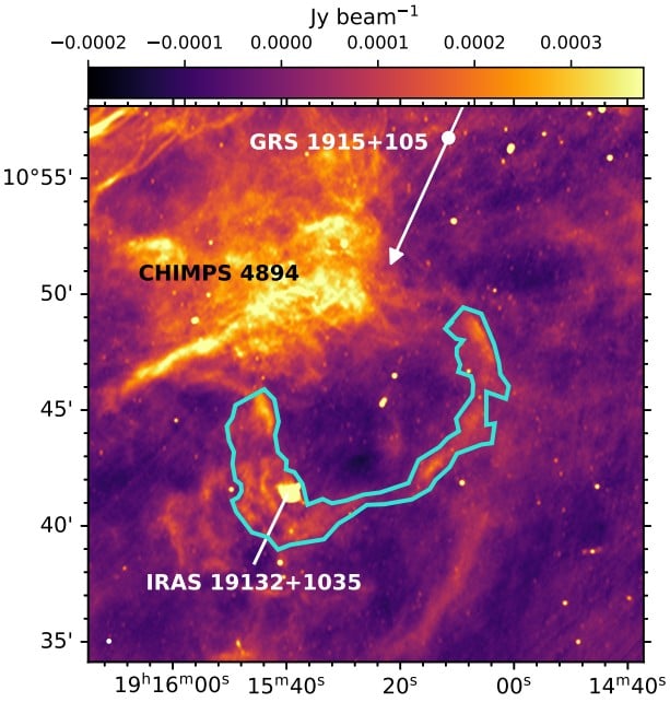 *This image shows the location of the black hole GRS 1915+105 and the direction in which its jet is pointing. IRAS 19132+1035 is a region of ionized gas and molecular clouds where the jet interacts with the ISM. The cyan outline marks the bow structure. Image Credit: Motta et al. 2025, A&A*