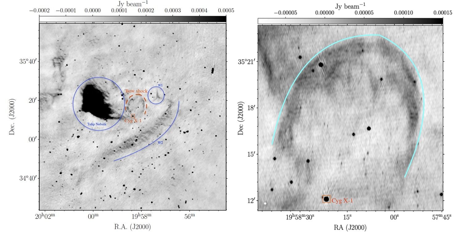 *These images from the research show the location of Cygnus X-1 and its surroundings, including the nearby Tulip nebula and W1 and W2, two newly detected diffuse emission regions. The image on the right shows Cygnus X-1 in orange and its bow shock in cyan. Image Credit: Atri et al. 2025 A&A*